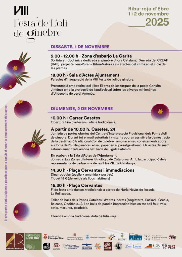 Riba-roja d’Ebre acollirà de l’1 al 2 de novembre la VIII Festa de l’Oli de Ginebre, una celebració, organitzada per l’associació Amics de Riba-roja, que enguany adquireix una rellevància especial amb la recent declaració dels forns d’oli de ginebre com a Béns Culturals d’Interès Nacional per part de la Generalitat de Catalunya. Per aquest motiu, comptarà amb la presència de la consellera de Cultura Sònia Hernández Almodóvar, acompanyada de la directora general de Cultura Popular, Carol Duran. La festa, que s’ha convertit en un espai de trobada entre cultura, recerca i tradició, oferirà un programa que combina reflexió, divulgació i activitats populars, refermant-se com una cita obligada al calendari cultural de les Terres de l’Ebre.